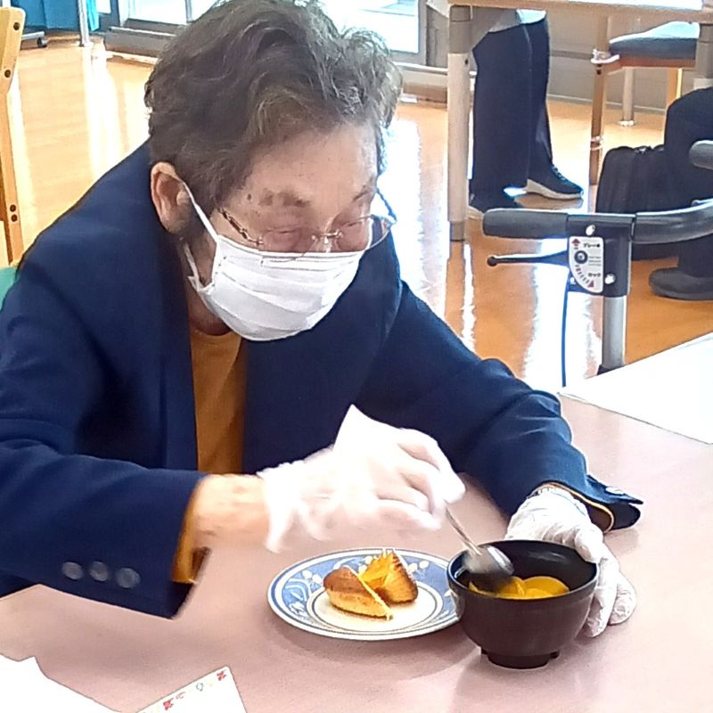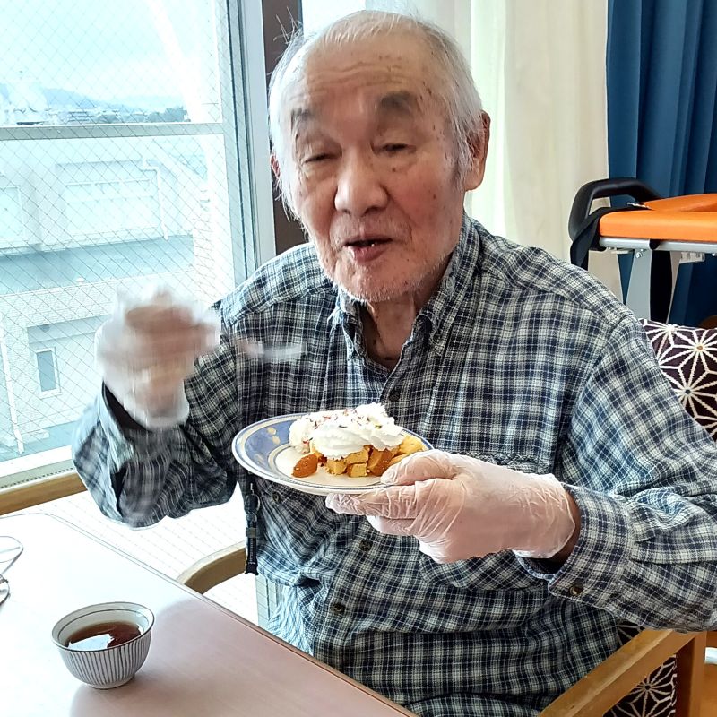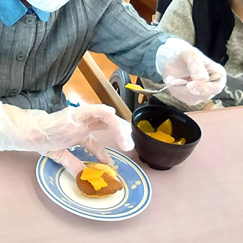 今日のおやつは土台にオレンジケーキ そこにフルーツとクリームをトッピング