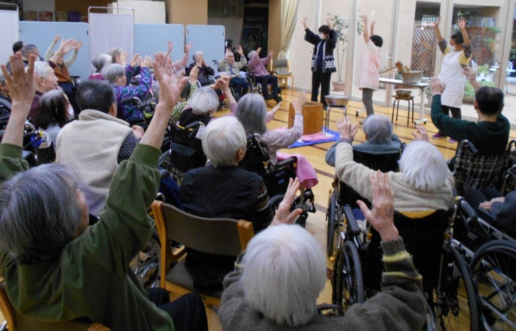 歌声シスターズ?(ご家族ボランティア)による準備体操 もちつき前に身体をほぐします